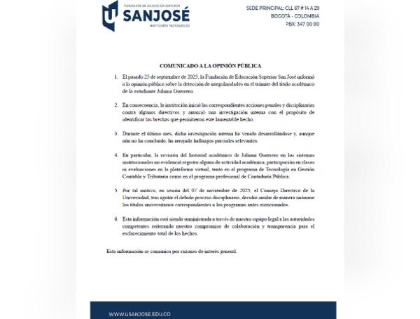 El grado universitario de la joven de 22 años fue anulado por la Fundación Universitaria San José días antes de presenta...
