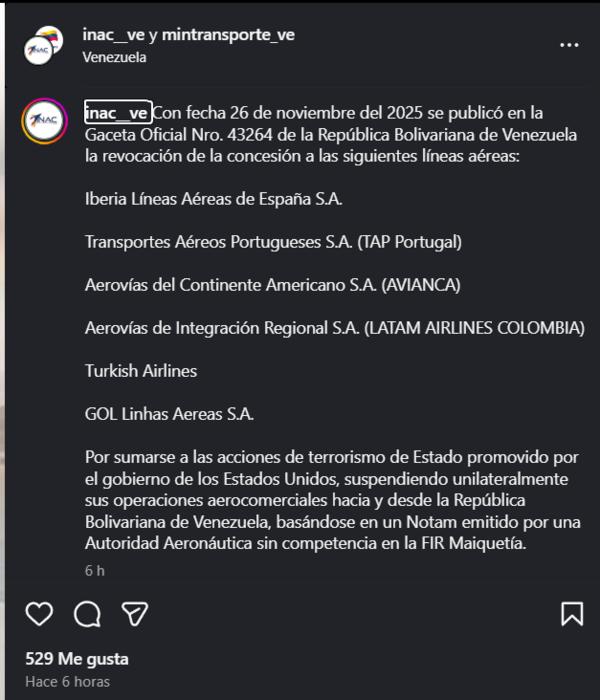 Caracas retiró las autorizaciones de vuelo a seis compañías internacionales, alegando acciones que 'atentan contra la se...