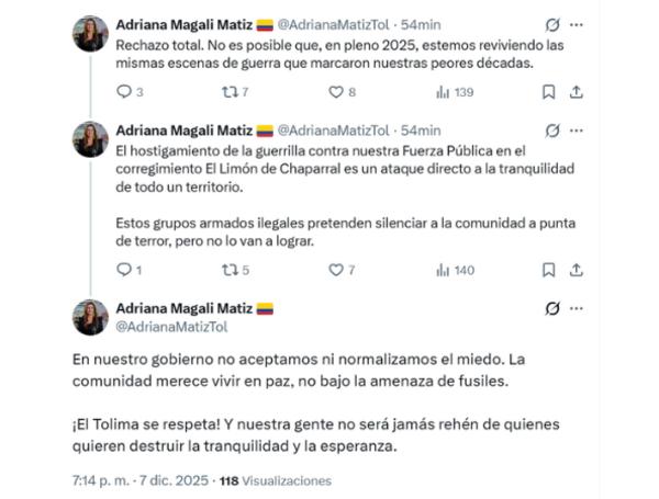 Gobernadora Adriana Magaly Matiz rechaza el ataque y advierte que la comunidad no será intimidada.La tensión regresó est...