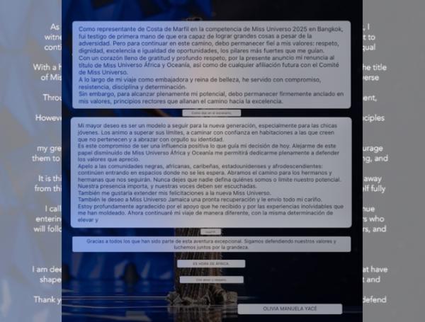 Miss Costa de Marfil, Olivia Yacé, renunció a su título Miss Universo África y Oceanía
