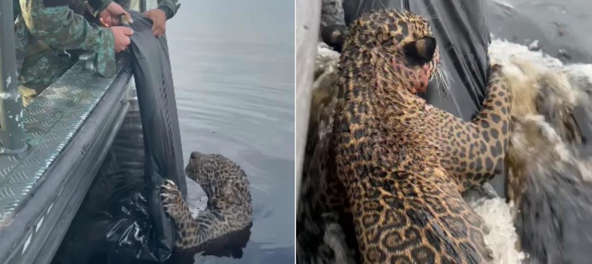 Jaguar herido que llevaba horas nadando fue rescatado del Río Negro por autoridades y especialistas en fauna silvestre de Brasil